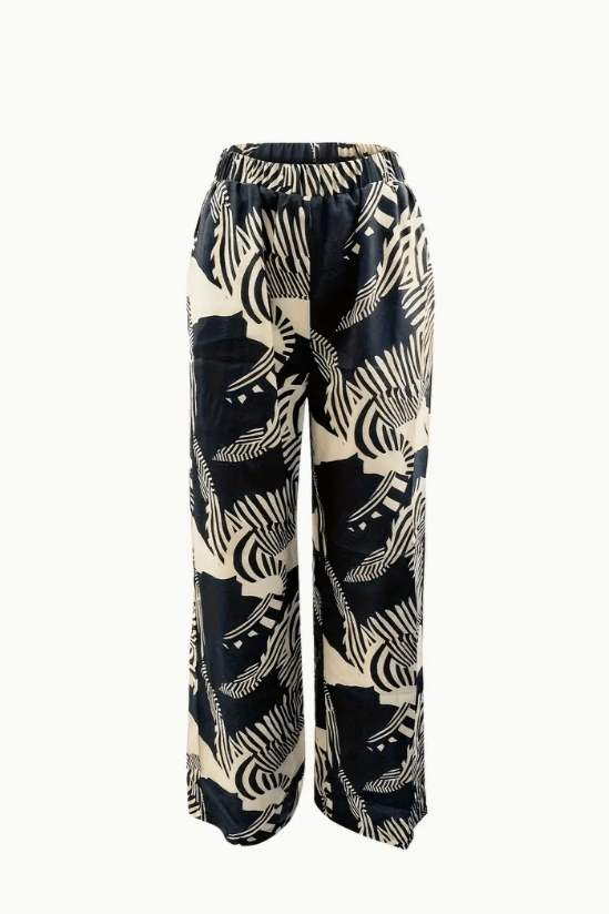 - Silhuet og pasform – toppens lette drapering komplimenterer buksernes grafiske mønster og skaber en naturlig silhuet.